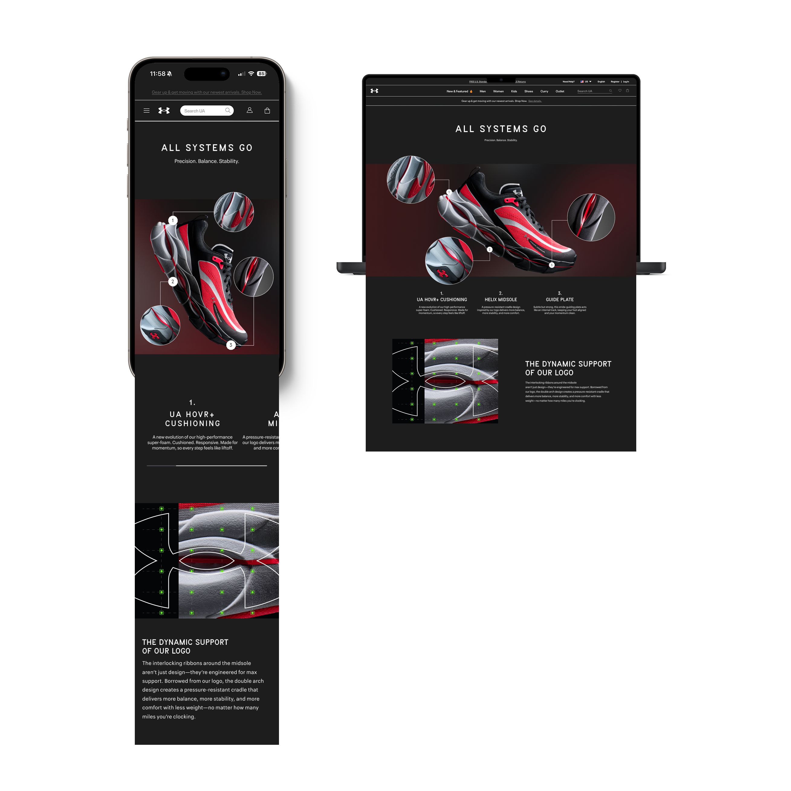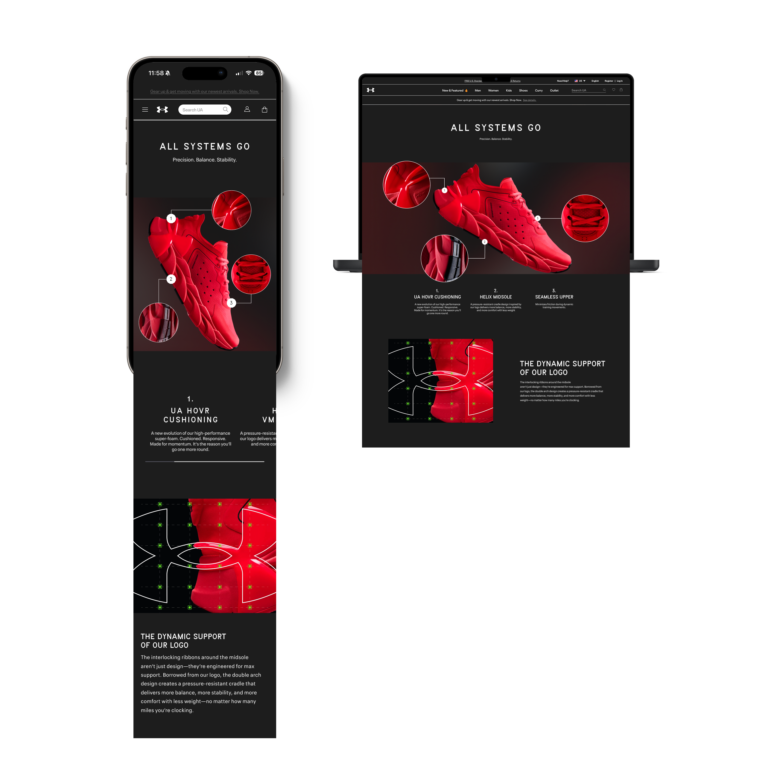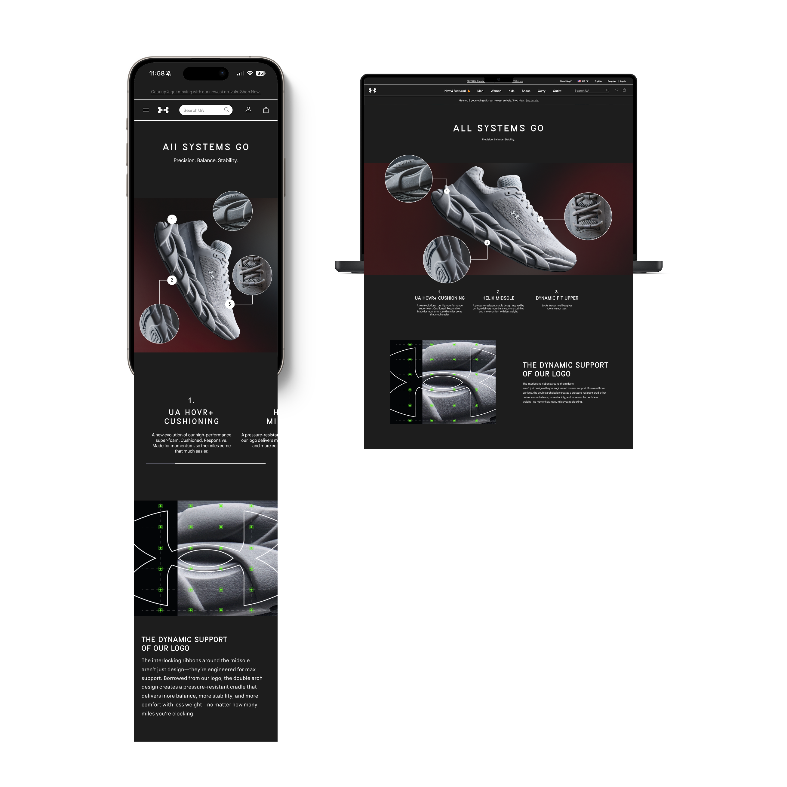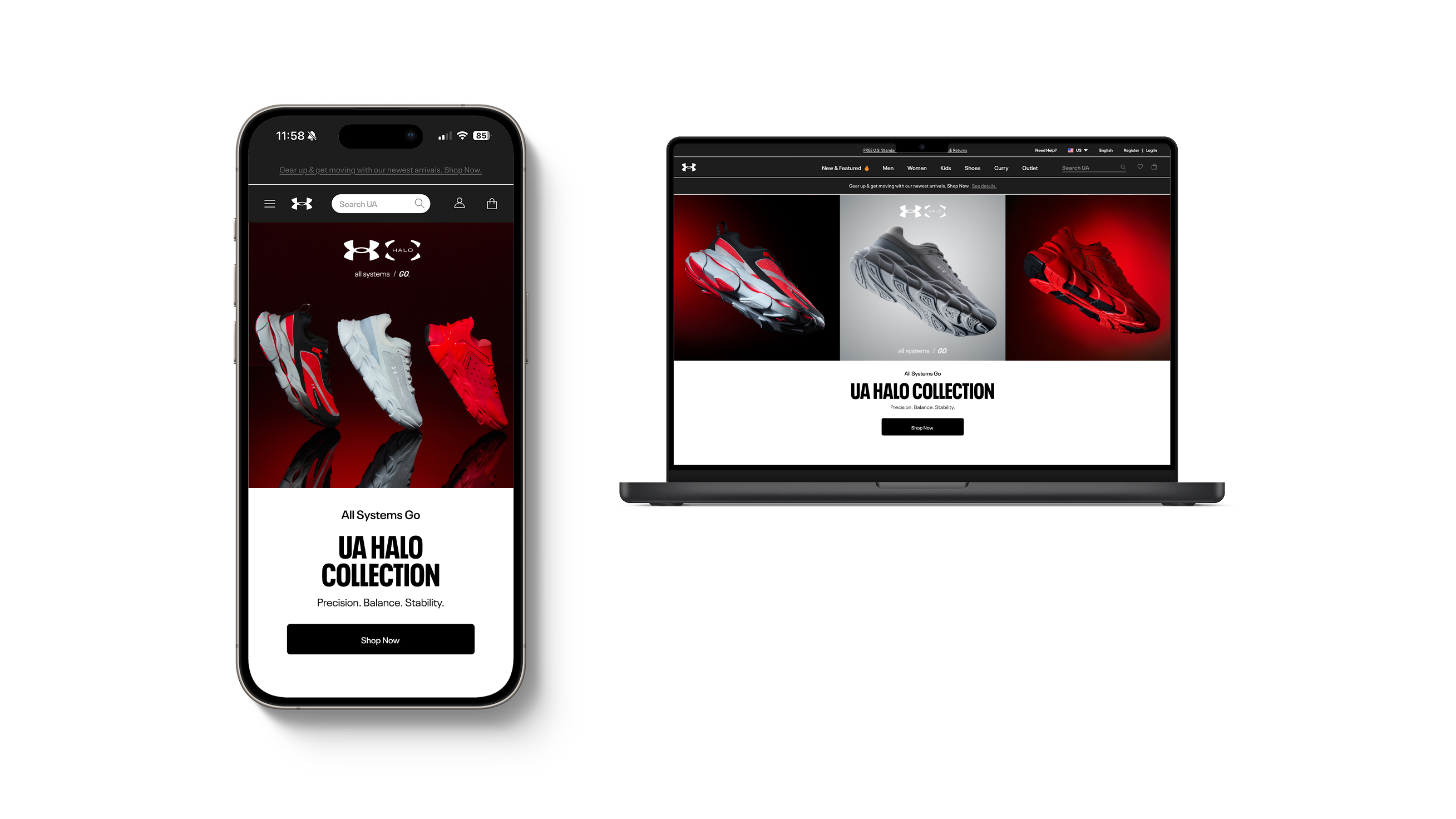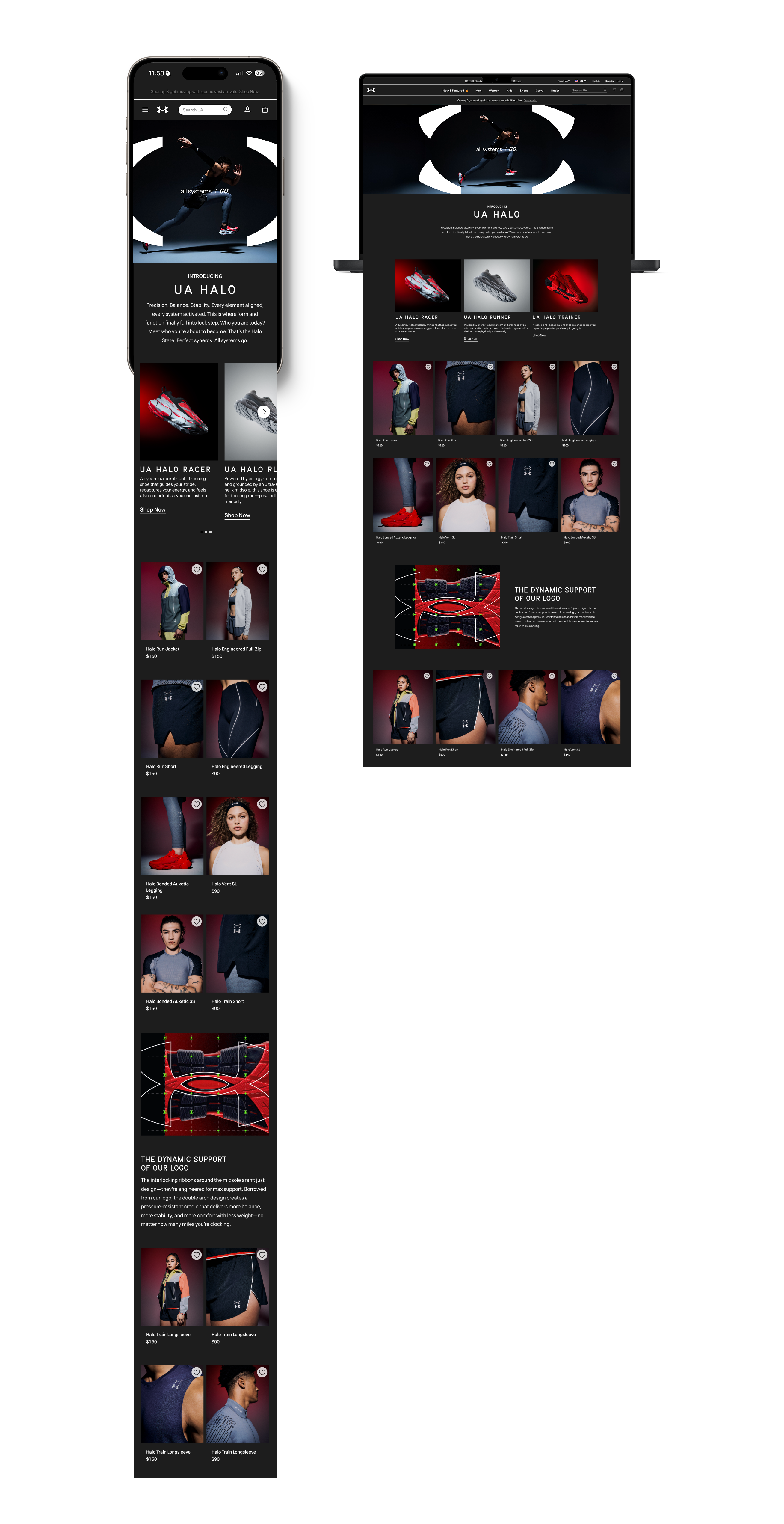 Supported the launch of UA HALO, a collection that redefined Under Armour’s footwear design language and visual identity. Partnered across brand and product teams to translate the campaign’s focus on symmetry, balance, and performance into compelling digital storytelling and e-commerce experiences. Led digital asset design, image curation, and site placement to bring the brand’s next era of footwear expression to life on UA.com and across global channels.