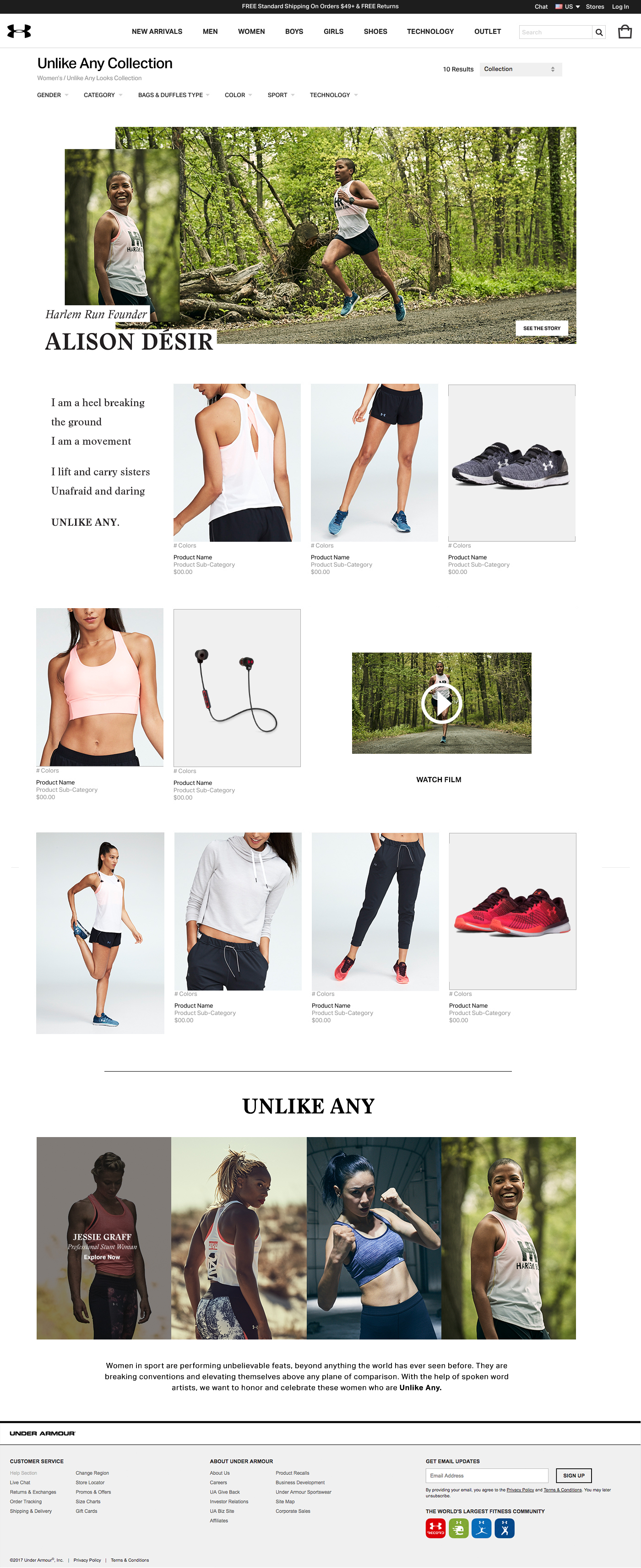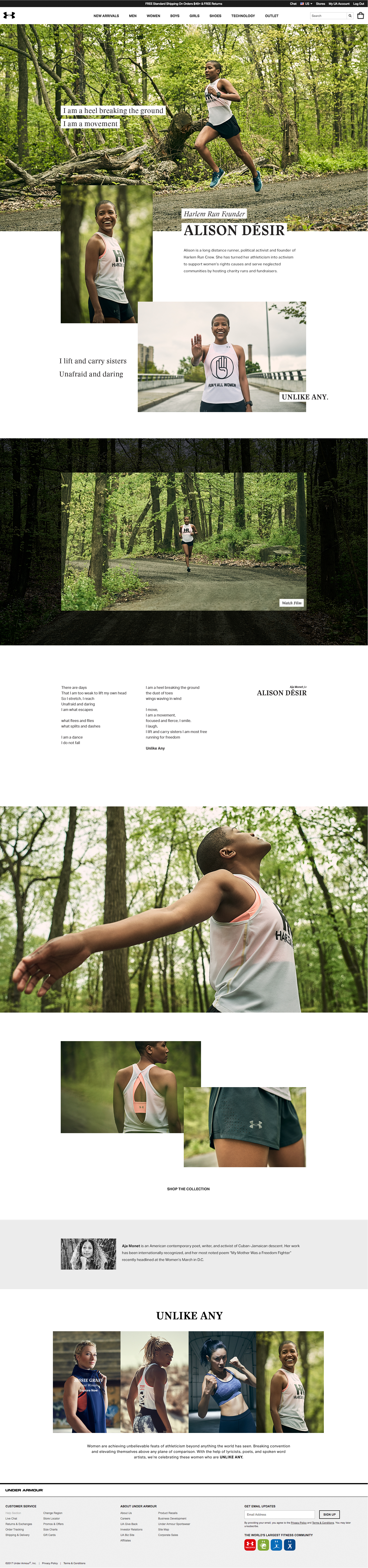 Collaborated with the team to bring Under Armour Women’s Unlike Any campaign to life through a shoppable experience on UA.com. I was tasked with designing the landing experience, product grids, product detail pages, email, and social media executions.